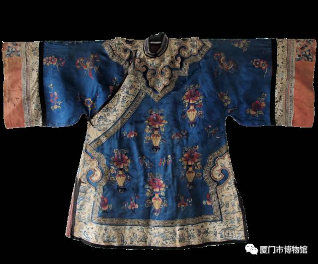 藍(lán)底白邊繡百子圖云肩大褂為粵繡的代表。滾邊上的百子圖栩栩如生,亭臺樓閣躍然紙上。這些都是命婦所穿的外罩大褂,也叫氅衣。