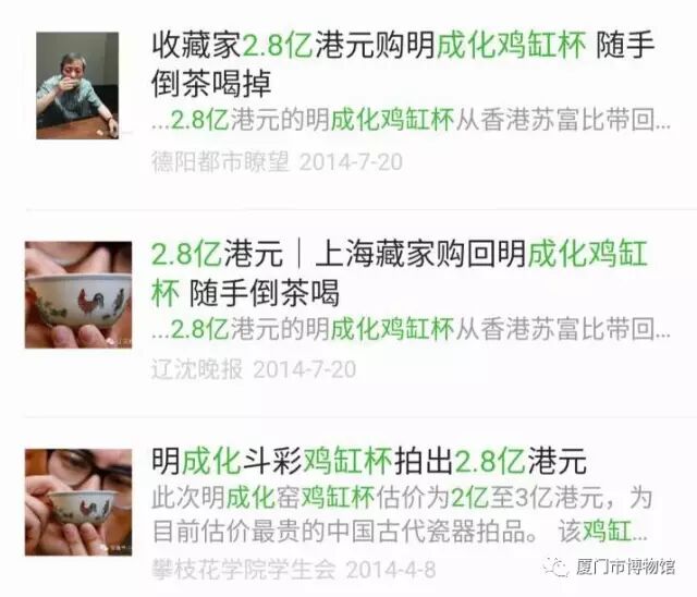 事情是這樣的:2014年7月19日,上海藏家劉益謙將以超2.8億港元成交價拍下的一件“明成化斗彩雞缸杯”從香港蘇富比帶回上海。18日,劉益謙在辦交接手續(xù)的過程中,用這件價值連城的雞缸杯喝了口茶,此舉被廣泛傳播到互聯(lián)網(wǎng)上,引發(fā)網(wǎng)友熱議。談到為何要用這件文物喝茶時,劉益謙表示:“這杯子距今有600年了,當(dāng)年皇帝、妃子都應(yīng)該拿它來用過,我無非是想吸一口仙氣。”