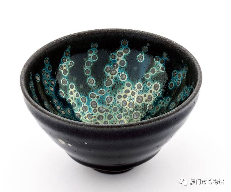 曜變天目 漆黑的器內(nèi)側(cè)有如星星般大大小小的紋樣,周圍是暈狀的青色和青紫色,被評(píng)價(jià)為根據(jù)角度的變換可在“器皿中看見宇宙”。曜變天目茶碗,現(xiàn)在在中國(guó)福建省建陽(yáng)市的窯坊制作而成。現(xiàn)存世界僅有3只并且都在日本,被認(rèn)定為國(guó)寶,都是南宋時(shí)代的作品,作者不詳。形狀、大小都很相似,所以也被說(shuō)成是同一人物的作品。在日本室町時(shí)代開始天目茶碗便被認(rèn)為是最高峰的地位。南宋的某個(gè)時(shí)期,在窯坊燒制的曜變天目茶碗屈指可數(shù),并且那以后再也沒有被燒制。至于為什么現(xiàn)存在日本,而非在制作的中國(guó)(有破裂欠缺狀態(tài)不完全的古物已經(jīng)被發(fā)現(xiàn)),依舊是個(gè)謎團(tuán)。