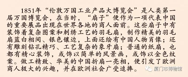 世博會,即世界博覽會(worldExhibitionorExposition,簡稱world Expo), 是一項有著悠久歷史和較大影響的國際性博覽活動,它匯集了當(dāng)時人類文明之大成,是進(jìn)行文化、物產(chǎn)、技藝等諸多方面展示和交流的世界大舞臺。在過往幾屆世博會上的中國展品中能輕易發(fā)現(xiàn)扇子的蹤跡,扇子與中國的關(guān)系是如此緊密,幾乎像資器、絲綢那樣,成為中國文化的象征之物,它曾多次出現(xiàn)在世博會的展臺上,并且奪得過金獎。