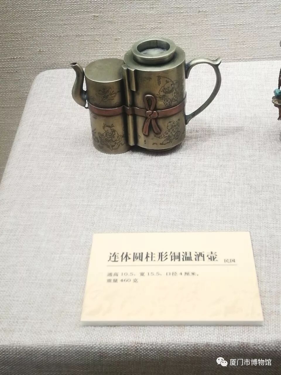 在維吾爾族講解員伊克拉木的介紹下,我們可以看到,這件連體圓柱形銅溫酒壺,造型非常別致,在壺體設(shè)計了一個腰帶的樣式,像極了古代包袱的樣子。仔細(xì)觀察這只酒壺,我們不難發(fā)現(xiàn)在酒壺的外壁刻畫的圖案是具有中原民俗文化特色的嬰戲圖,這個圖案也可以從側(cè)面說明不同民族文化在異域相互碰撞中慢慢地融合在一起。