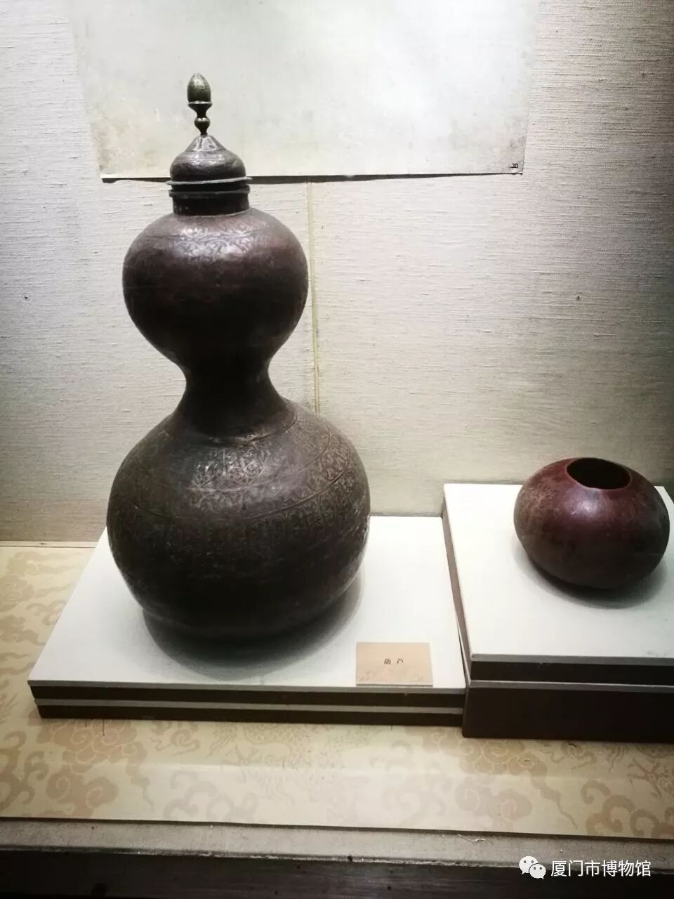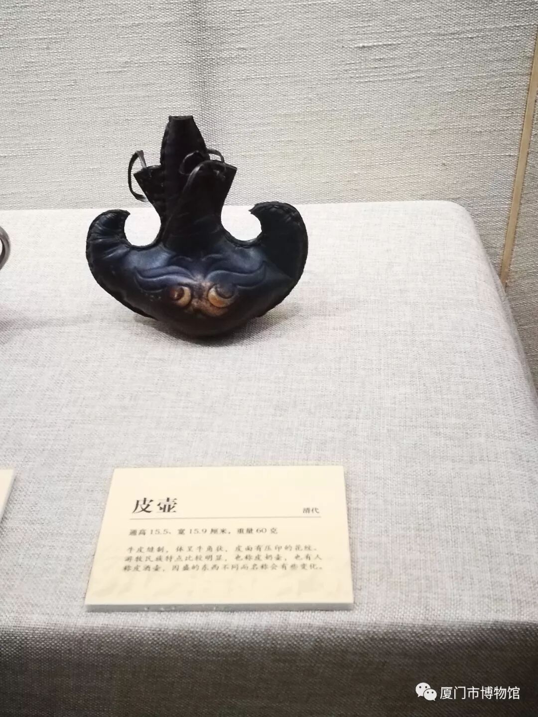 除了日??呻S身攜帶的造型小巧的飲水器,在展柜里還陳設(shè)一件體積比較碩大的葫蘆造型的儲水器。和我們平時常見的圓柱形的儲水器不大一樣,這件葫蘆型的儲水器除了儲水量大以外,它的造型更便于游牧民族在遷徙的時候隨車攜帶。