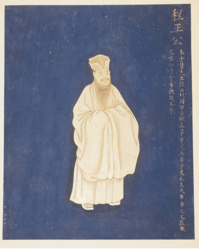紙本,縱37厘米,橫27.3厘米。此冊頁磁青底,描金設(shè)色,每頁一幅,現(xiàn)存38幅,疑有脫頁。所繪畫人物為古代高士明賢,依序?yàn)闈h高祖、蘇子卿、陶清節(jié)、李太白、顏忠節(jié)、歐陽文忠公、張文成、嚴(yán)子陵、王右軍、杜工部、顏文忠、邵堯夫、東方曼倩、龐德公、狄文惠、司馬真一、真西山、司馬遷、諸葛忠武、張文獻(xiàn)、張忠丞、韓文公、張橫渠、曾文定、司馬文正、蘇文公、蘇文忠公、劉忠定、程正公、岳忠武王、狄武襄、蔡忠惠、朱文公、楊龜山、羅豫章、李忠定、李延年、文信公。