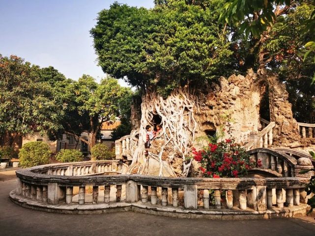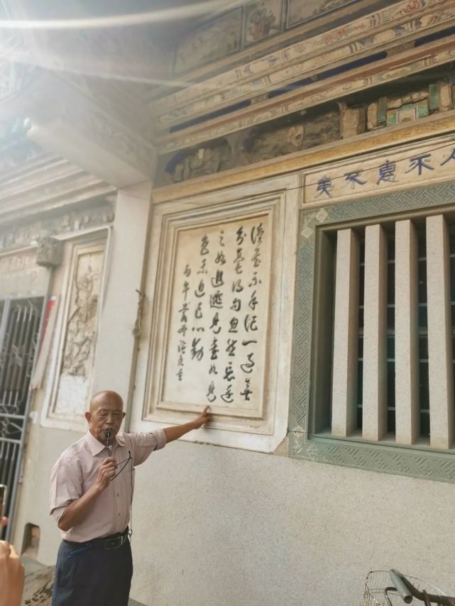 陳老八十有余,聲音洪亮、富有深情。從他的介紹中我們了解到,蓮花洲四面環(huán)水,以上花園為中心,呈品字,形成建有大厝、學(xué)堂和祠堂的閩南古厝群,為旅越華僑陳炳猷1905年修建,原占地3萬平方米,是省級文物保護(hù)單位、愛國主義教育基地。大家在陳老的帶領(lǐng)下,一路欣賞風(fēng)景、品讀“樂善好施”(御賜)和“此地半山半水,其心不惠不夷”之家風(fēng),體會華僑的民族情懷。