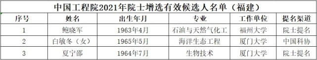 根據(jù)中國(guó)工程院公布名單顯示,化工、冶金與材料工程學(xué)部中,福州大學(xué)石油與天然氣化工專業(yè)鮑曉軍入選;環(huán)境與輕紡工程學(xué)部中,廈門大學(xué)海洋生態(tài)工程專業(yè)白敏冬入選;醫(yī)藥衛(wèi)生學(xué)部中,廈門大學(xué)生物技術(shù)專業(yè)夏寧邵入選。