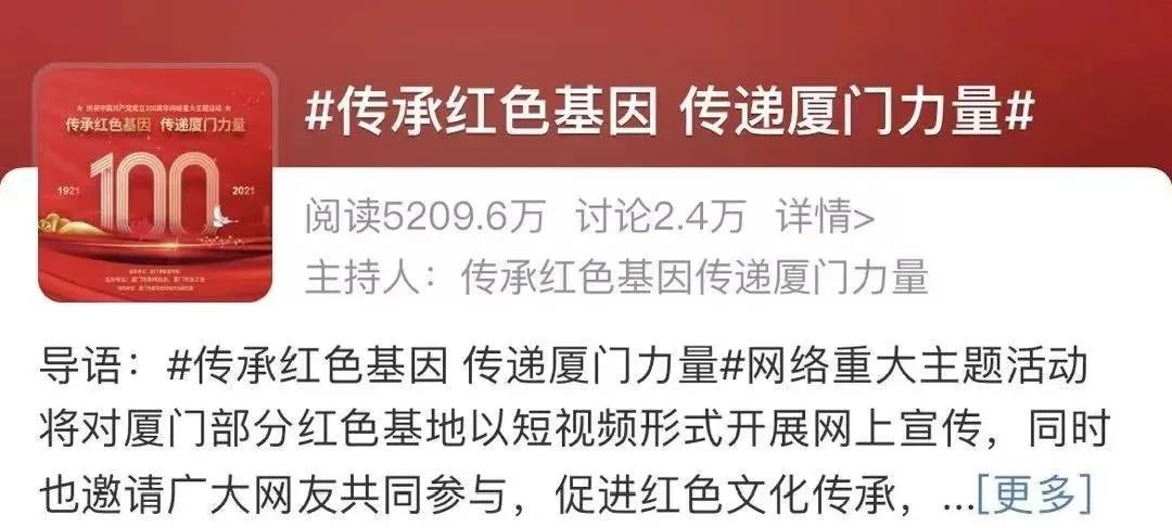 “傳承紅色基因傳遞廈門力量”慶祝建黨百年網(wǎng)絡(luò)重大主題活動以明星+網(wǎng)紅錄制視頻并直播的形式推介廈門紅色教育基地,微博、抖音等相關(guān)話題總閱讀量近8000萬,增強紅色陣地、紅色基因在網(wǎng)上的傳播力、影響力。