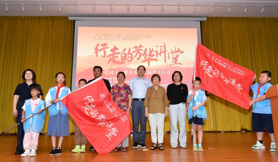 在全場(chǎng)矚目下,英雄奶奶代表許含笑、許麗乖登上舞臺(tái),鄭重地將“行走的芳華講堂”活動(dòng)隊(duì)旗交到“海峽少年”代表手中。這一莊嚴(yán)的交接,正式啟動(dòng)親子健步行活動(dòng),也傳遞著薪火相傳的紅色使命。