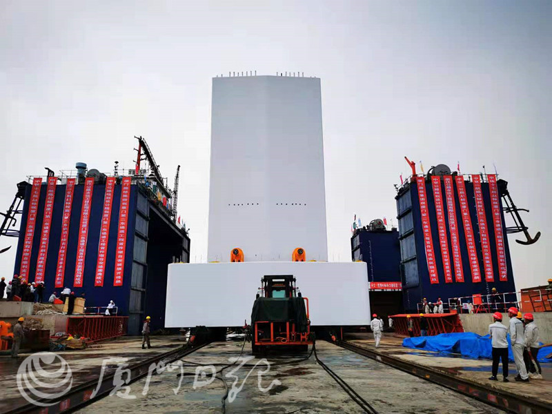 當天預制墩臺將橫移至船上,15日墩臺出運,16日將在海上預定點位吊裝,廈門第二東通道A3標黨工委副書記鄧湘波介紹:“裝配式跨海大橋的墩臺在預制場內(nèi)采用立式預制,半潛駁儲運海上安裝工藝,建設規(guī)模大,施工技術復雜,實施難度高,今天下午的橫移難點在于從墩臺場橫移至船上有一段臨時焊接的,能不能有效承重關系到橫移的成敗。”