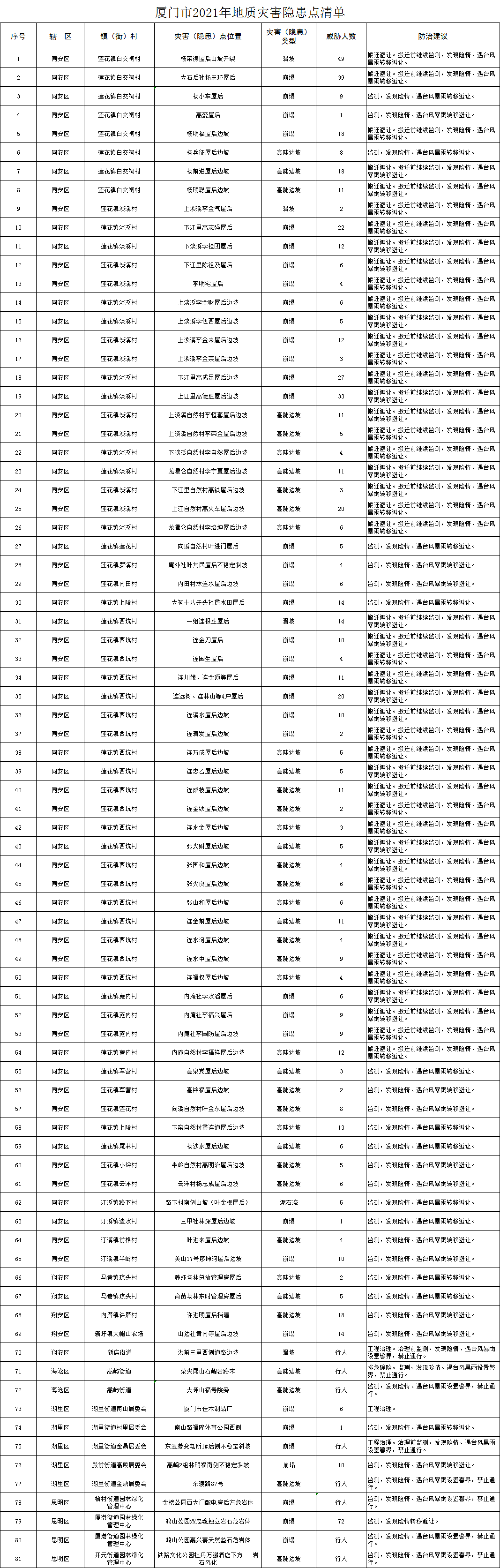 4月27日,市資源規(guī)劃局公布了主要地質災害隱患點清單,共有81處: