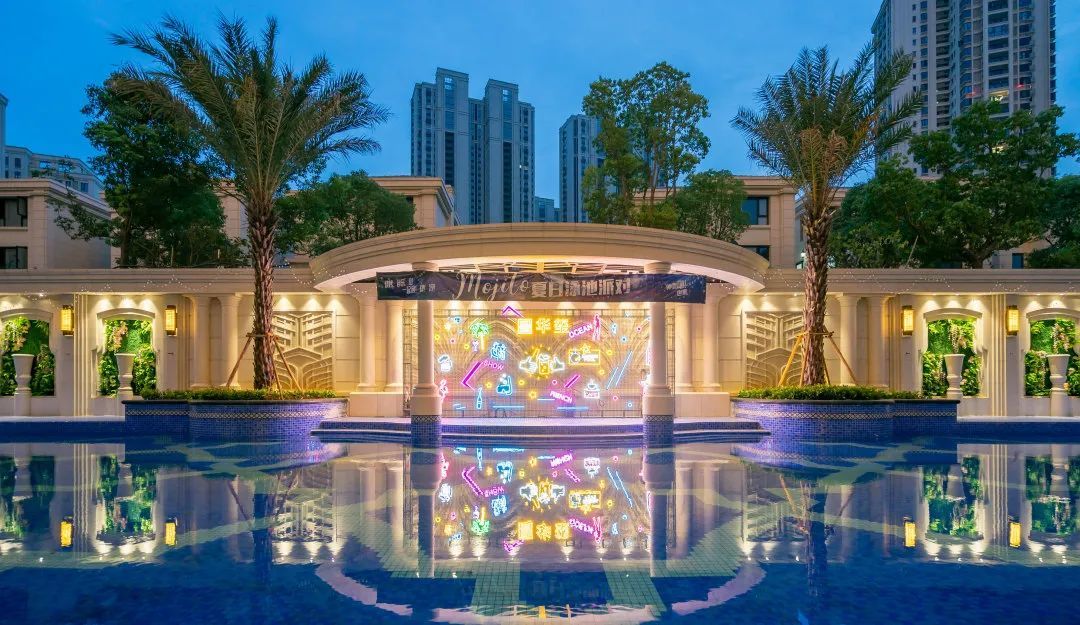 約500㎡法式藝術(shù)泳池,雙池分離設(shè)計(jì),底部藝術(shù)化圖形,高約3.6米泳池石材背景墻與法式園林的疊景設(shè)計(jì),定義家門口的度假生活。
